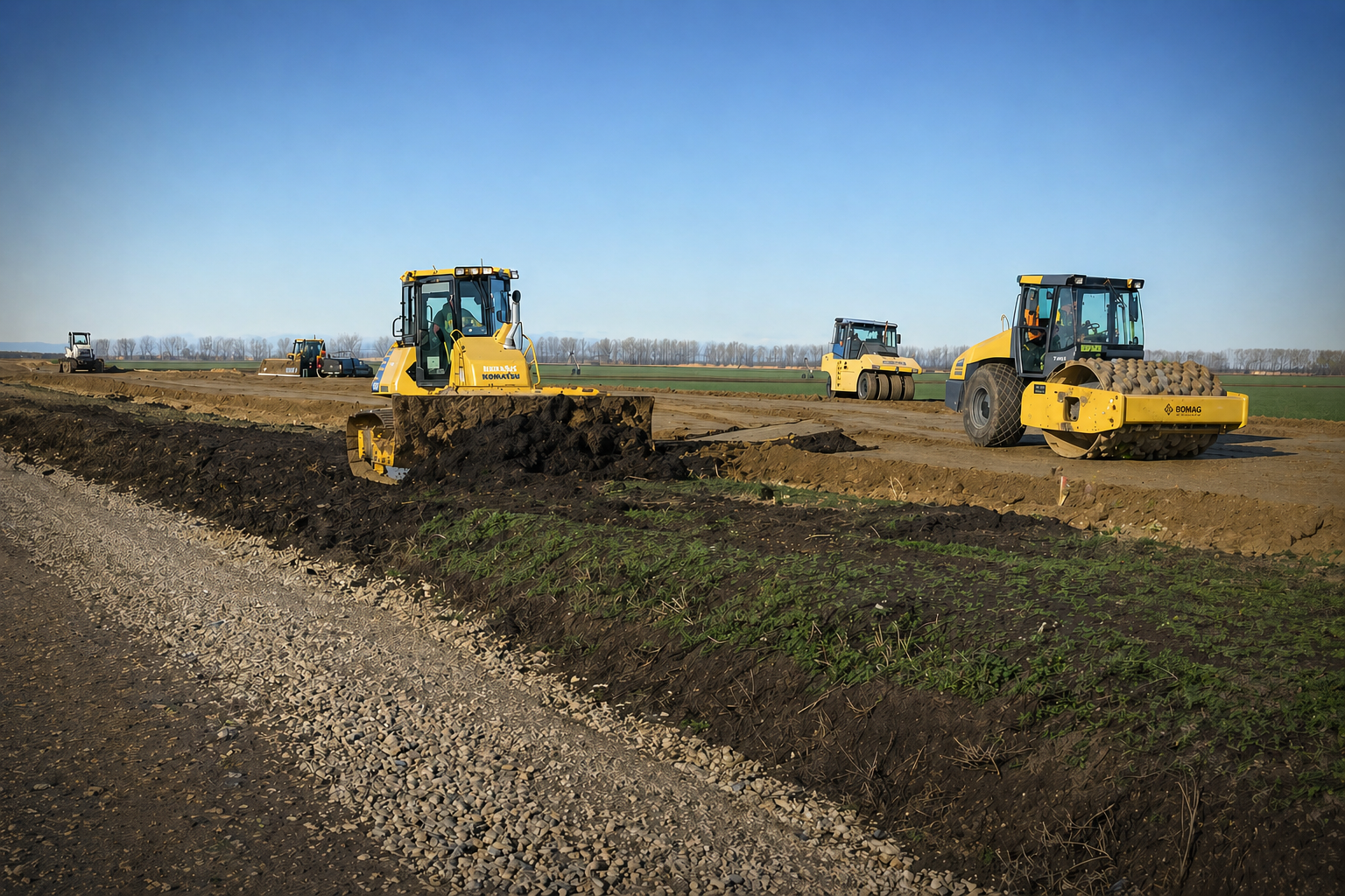 csarnoképítés, autópálya építés, gépi földmunka, komplett útépítés, közterületi térburkolás, kerékpárút építés, bontási munka